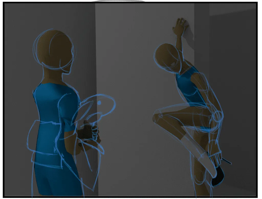 I decided to use my 3D mannequins to compose the shot since I knew I’d want to fiddle with how far apart Kamiko and Chang’e would be standing to one another and the camera angle of the scene. Originally, I thought it should be more overhead.