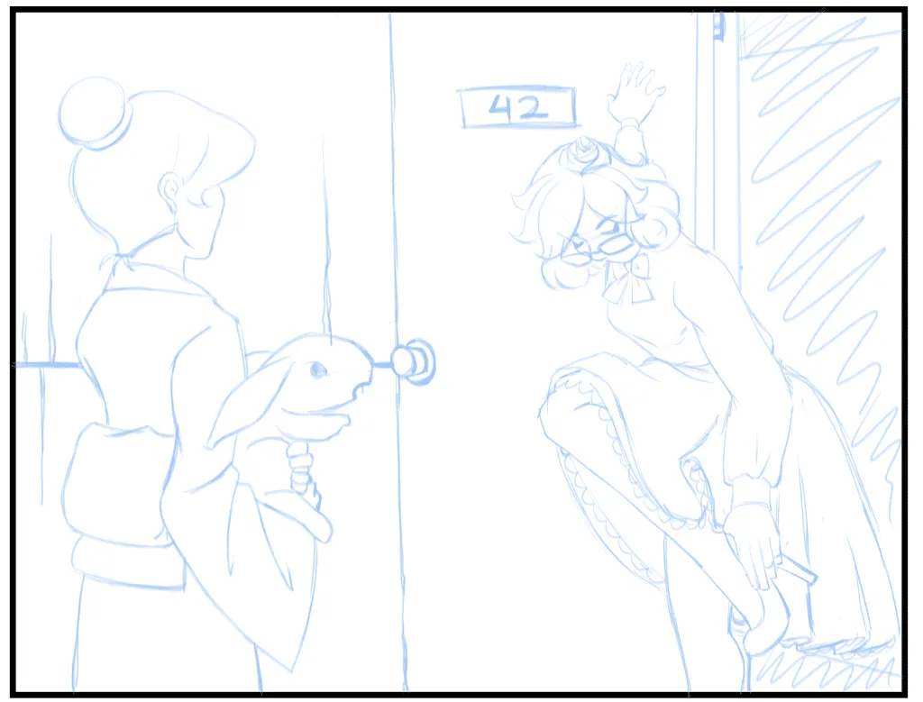 In frame 1 Kamiko has a pretty complex pose, and I didn’t know how I wanted to draw it. Where should I put the camera? How should I compose the shot I see in my head?